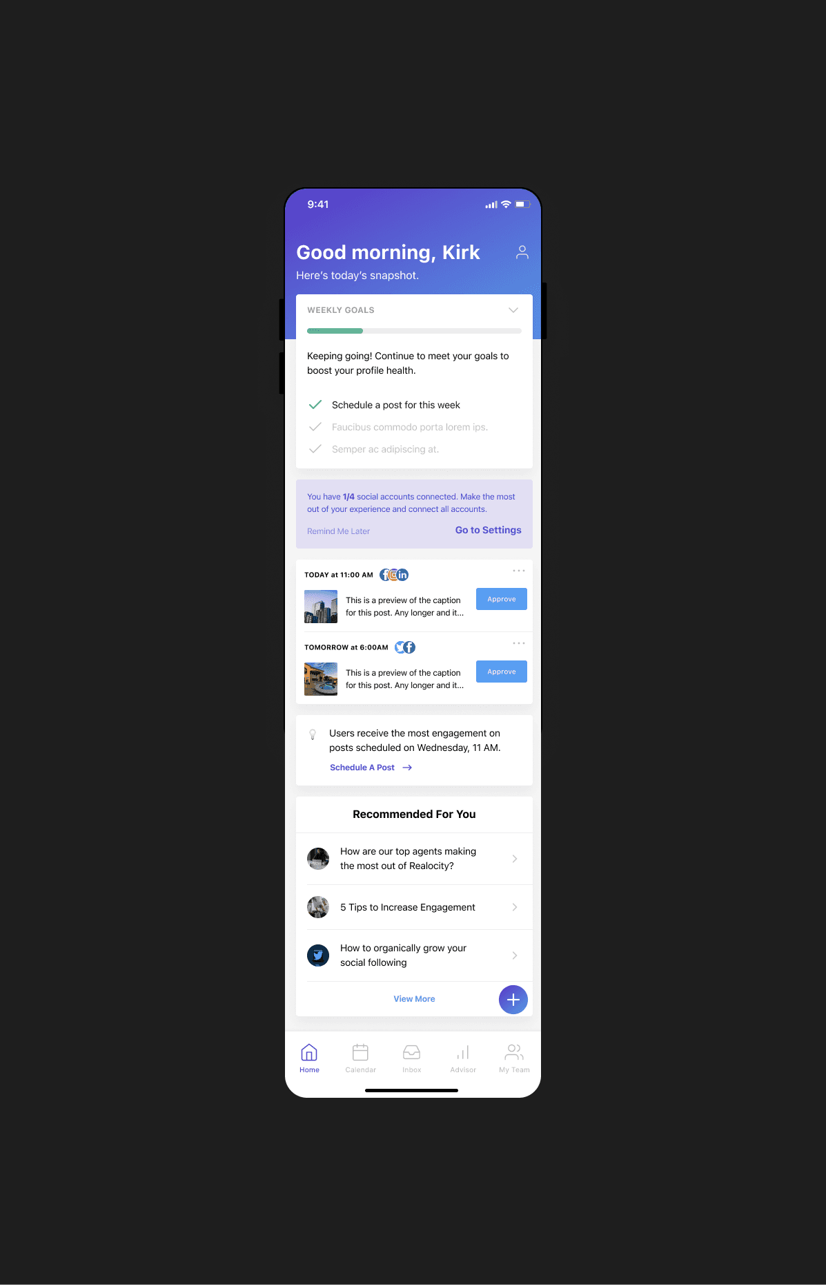 Realocity is a social media management system geared towards Real Estate agents. The team has been managing the social presence for Real Estate agents for years. Between phone calls and emails, they are consistently communicating with each agent to ensure that they are authentically representing them online while creating content that matches their brand.